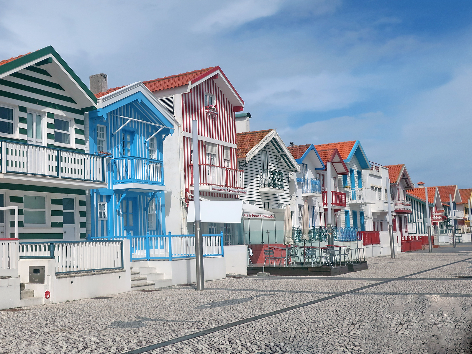 Als die Fischer begannen, ihre Scheunen zu bauen, mussten sie sich auf einen schwierigen Boden einstellen. So nahe an der Küste waren sie mit weichem Sand konfrontiert, deshalb nutzte man Stege, die in den Sand gerammt wurden. Diese Pfahlbauten wurden als „Palheiros“ bezeichnet. Außen brachte man lange Holzscheite an, horizontal und mit Farben gestrichen – der Anfang der bunt gestreiften Holzhäuschen an der Costa Nova. Um sich von den hellen und ineinander verlaufenden Farben des Sandes und der Küste abzuheben, strich man die Häuser in leuchteten Farben, damit man sie vom Wasser aus besser sehen konnte.