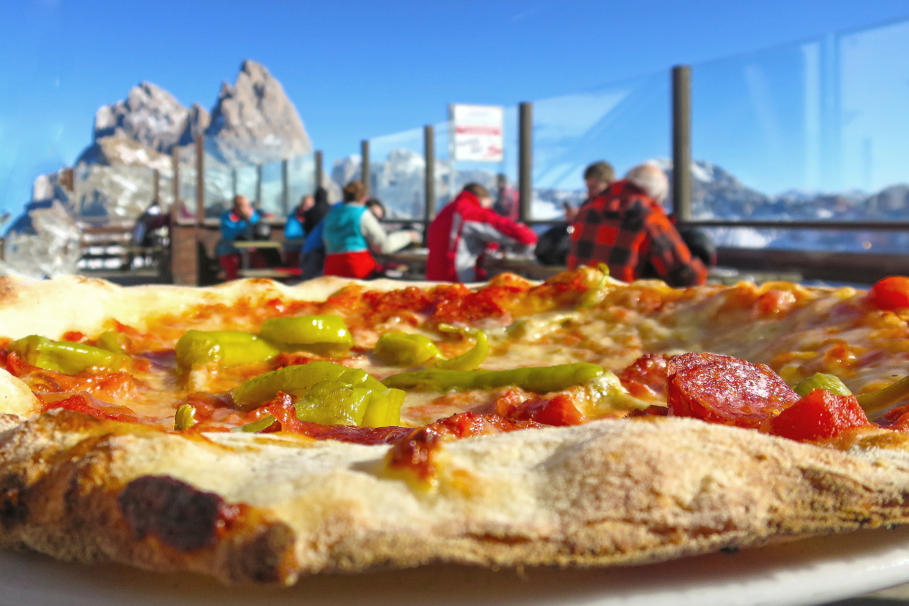 Während auf österreichischen und deutschen Skihütten Germknödel und Pommes der Verkaufsschlager sind, bringt man in Gröden mit Pizza und Pasta italienische Highlights auf die Teller, sogar auf den Skihütten, wo es meist schnell gehen muss. 300.000 Pizzen werden hier in einer Saison zu Mittag verkauft, auf fünf Hütten, die Holzofenpizza auf ihren Karten stehen haben, zum Beispiel im „Restaurant Seceda Hütte“ (direkt bei der Bergstation der Seceda Alm).