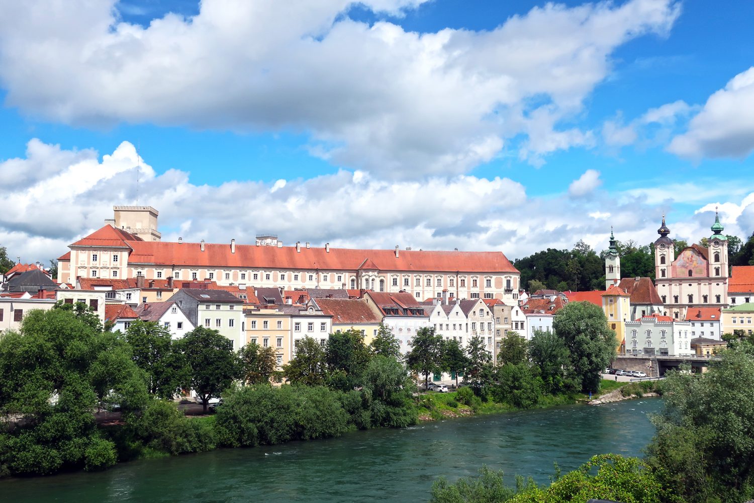 Genau hier thront eines der Wahrzeichen der Stadt, das dem Panorama am Zusammenfluss das besondere Flair verleiht. Die Barockkirche St. Michael erhebt sich am Ende der Steyr-Brücke. Der zwei-türmige Barockbau wurde von 1635 bis 1677 errichtet. Zwischen den Türmen verbirgt sich ein Giebel mit einem Fresko des Heiligen Michael mit dem Sturz der gefallenen Engel. Das Innere der Kirche stammt aus dem Frühbarock, vor allem die opulente Rokokoeinrichtung ist sehenswert.
