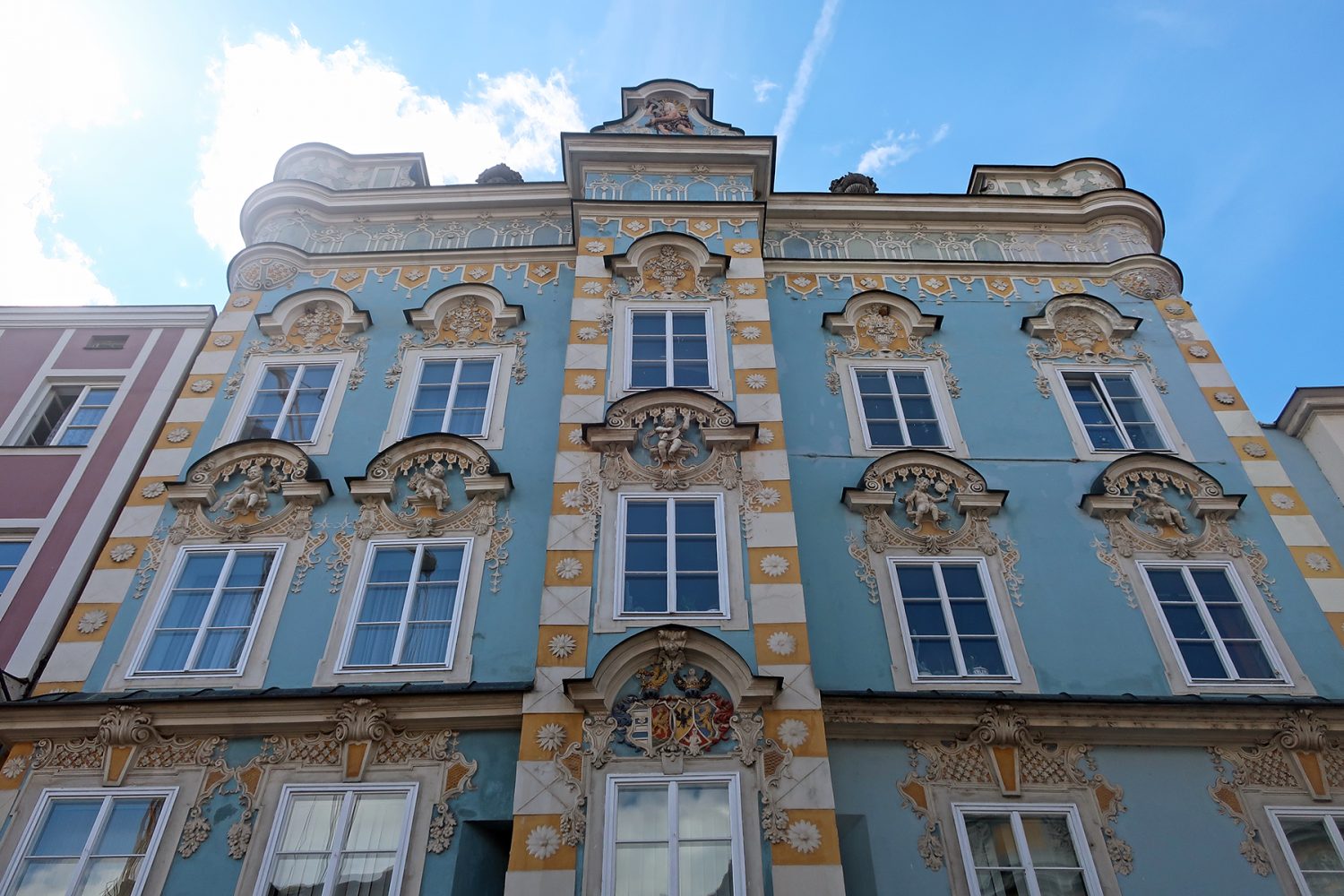 Aus dem Rokoko stammt das Rathaus von Steyr, das zentral auf dem Stadtplatz steht. Hier befindet sich auch die Touristeninformation. Das Rathaus wurde von 1765 bis 1778 von Gotthard Hayberger errichtet, der Bürgermeister und Stadtrichter von Steyr war. Besonders auffällig ist der Balkon über dem Portal, auf dem sich auch das Stadtwappen befindet: ein Flammen speiender Panther. Auf der Balustrade symbolisieren indes vier barocke Frauengestalten die Machtbefugnisse der Stadt von einst. Justizia mit Schwert und Waage, Strafrecht mit Eisenkugel und Kette am Fuß, Kirchen-Patronanz mit Weihrauchgefäß und und Römisches Recht mit Buch in der Hand.